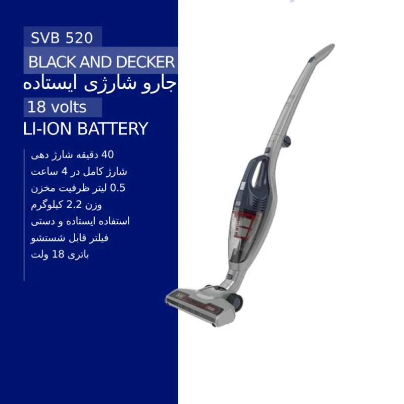 جارو شارژی بلک اند دکر مدل SVB520 یکی از گزینه‌های کاربردی و جمع‌وجور برای نظافت روزمره است که با طراحی سبک و وزن تنها ۲ کیلوگرم، حمل و جابه‌جایی آن بسیار راحت خواهد بود. این دستگاه از یک باتری لیتیومی ۱۸ ولتی بهره می‌برد که در مقایسه با باتری‌های قدیمی‌تر، هم دوام بیشتری دارد و هم شارژدهی بهتری ارائه می‌دهد. با یک‌بار شارژ کامل، این جارو شارژی تا ۴۰ دقیقه کارایی مداوم در اختیار شما قرار می‌دهد که برای تمیز کردن سریع خانه، ماشین یا فضاهای کوچک کاملاً کافی است.