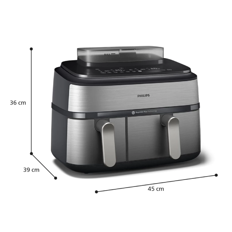 • ظرفیت بزرگ: گنجایش 9 لیتر همراه با دو سبد مجزا برای پخت هم‌زمان یا جداگانه انواع غذا.